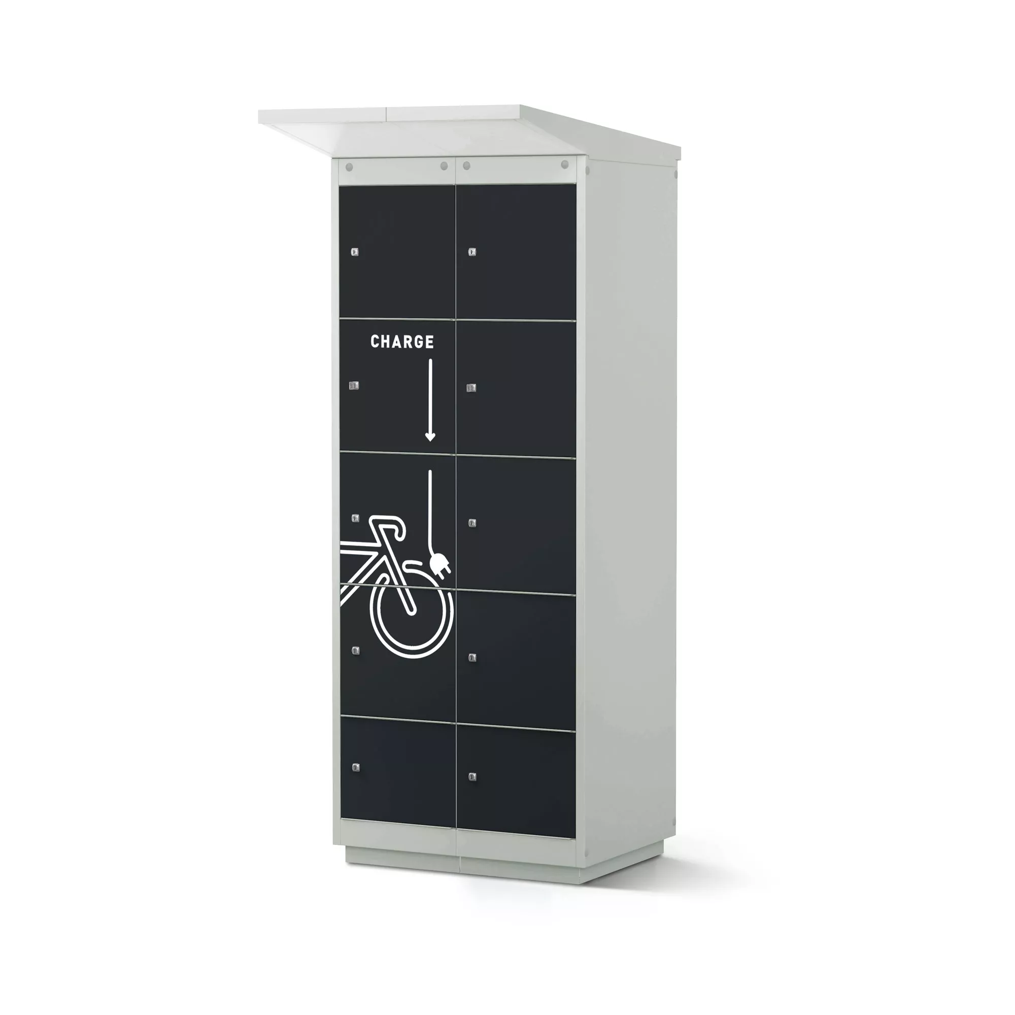 La borne de recharge pour vélos électriques est proposée en plusieurs teintes. Le compartiment de service est équipé en standard d'une serrure cylindrique. Une clé principale pour les ouvertures d'urgence est fournie avec la livraison, ainsi qu’un jeu d'autocollants de traçage à apposer soi-même.