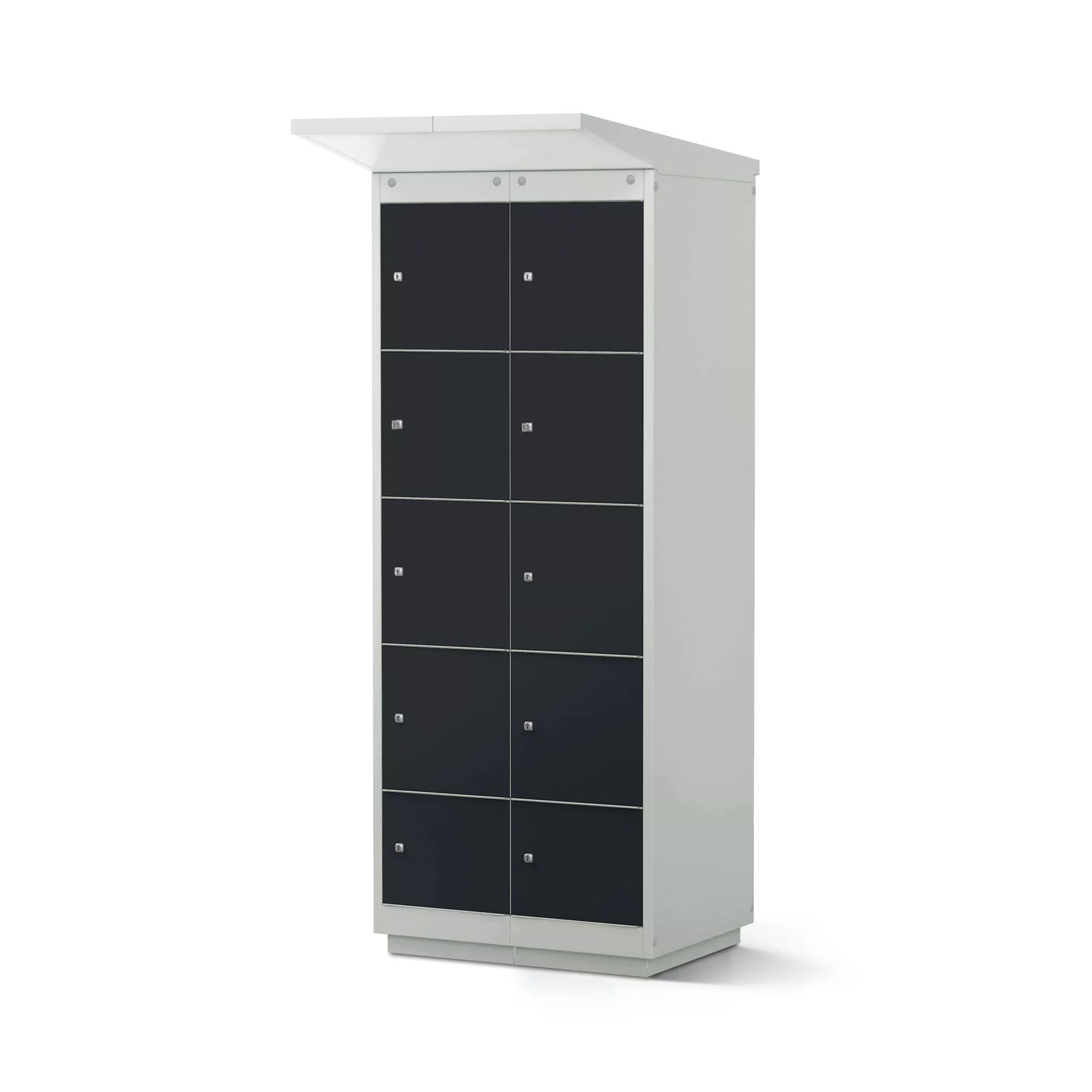 Son corps robuste en tôle d’acier traité anti-humidité et résistant aux intempéries est revêtu d’une peinture cuite au four résistante aux UV. Les portes à double paroi, parfaitement ajustées grâce à une fermeture magnétique, protègent efficacement le contenu contre la poussière et l’humidité. Pour un confort d’utilisation, les compartiments supérieurs ont des prises légèrement abaissées, et chaque colonne intègre tout en bas un compartiment de service verrouillable.