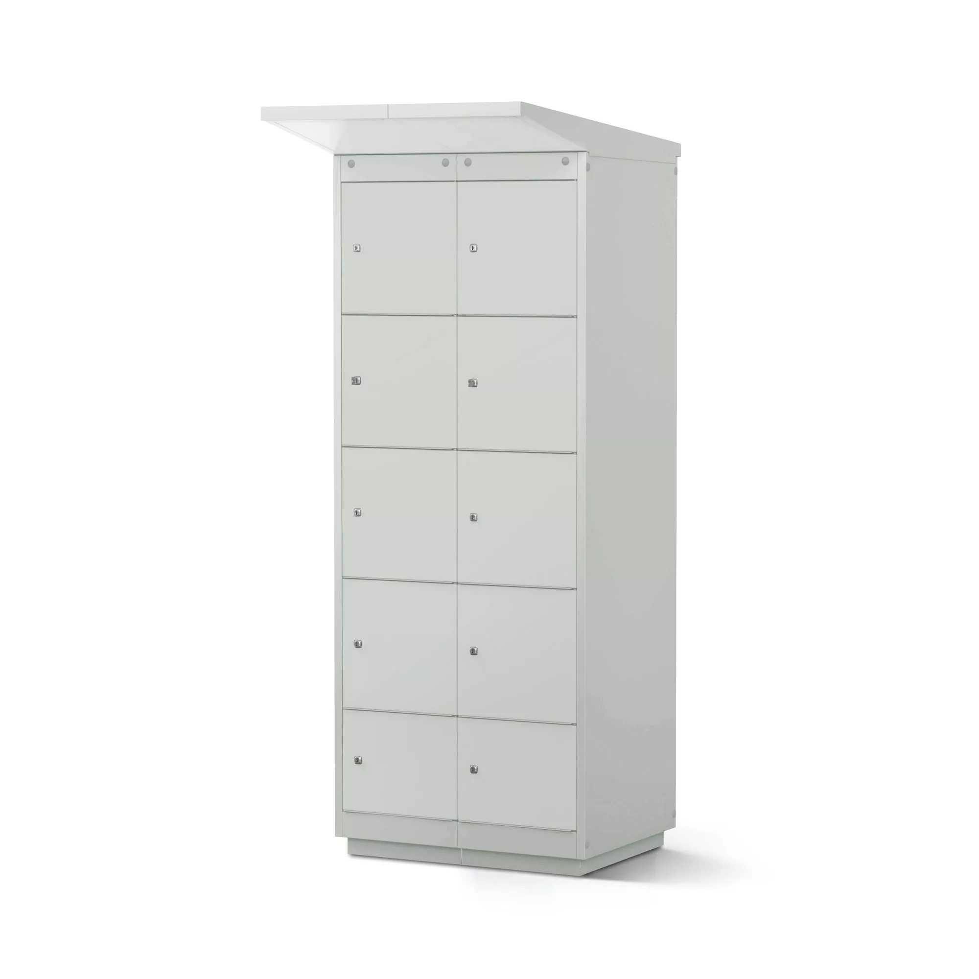 Son corps robuste en tôle d’acier traité anti-humidité et résistant aux intempéries est revêtu d’une peinture cuite au four résistante aux UV. Les portes à double paroi, parfaitement ajustées grâce à une fermeture magnétique, protègent efficacement le contenu contre la poussière et l’humidité. Pour un confort d’utilisation, les compartiments supérieurs ont des prises légèrement abaissées, et chaque colonne intègre tout en bas un compartiment de service verrouillable.