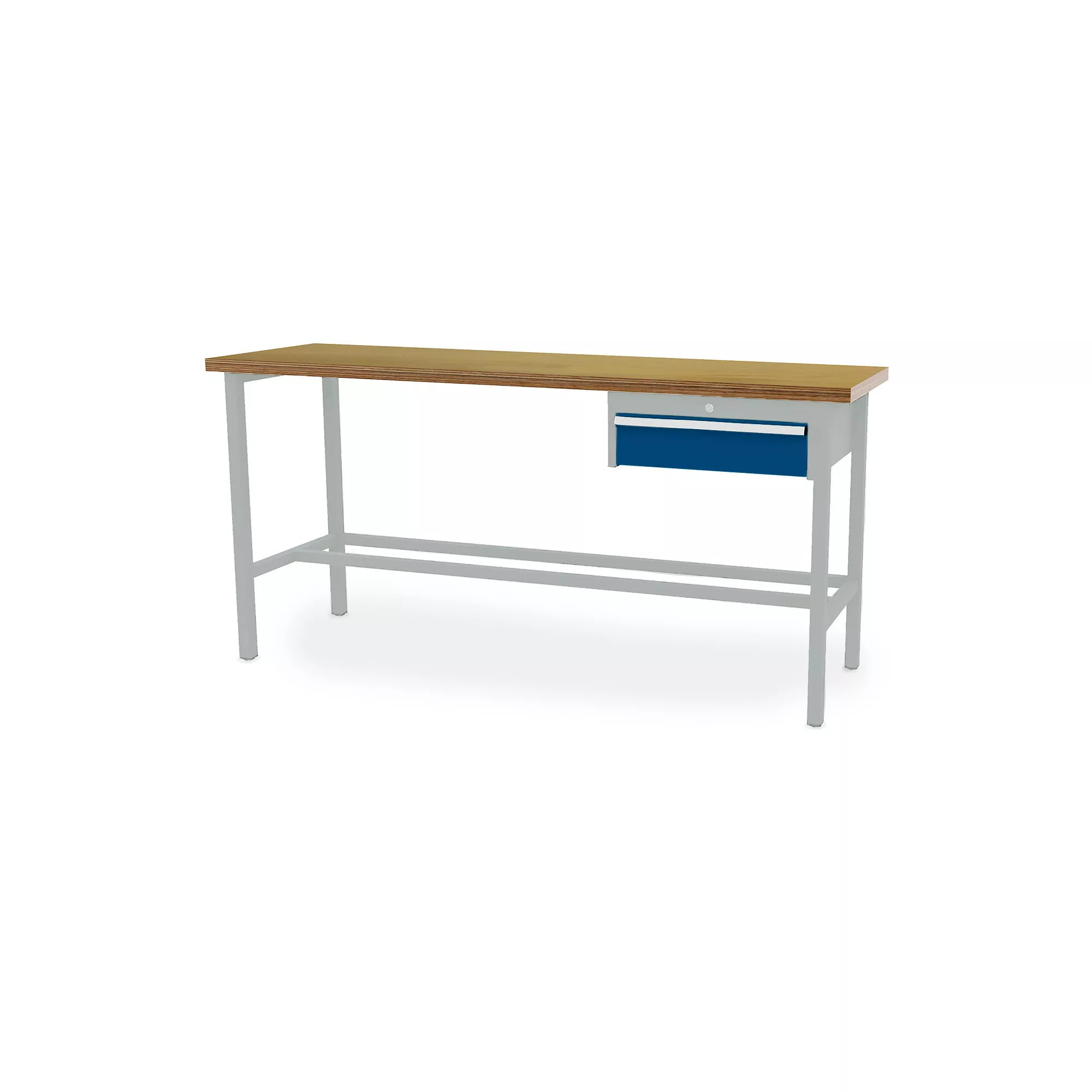 Der komfortable Arbeitstisch besticht durch seine exzellente Verarbeitung und das herausragende Preis-Leistungs-Verhältnis. Die zwei Meter lange massive Buche-Multiplex-Platte sorgt für eine langlebige und robuste Arbeitsfläche, die auch intensiver Nutzung standhält. Mit einem Unterhängeschrank auf der rechten Seite und einer geräumigen Schublade stellt der Tisch genügend Stauraum für Ihre Werkzeuge und Materialien bereit. Das Gestell ist aus pulverbeschichtetem Vierkantrohr gefertigt und verleiht dem Arbeitsplatz eine besonders große Stabilität.
