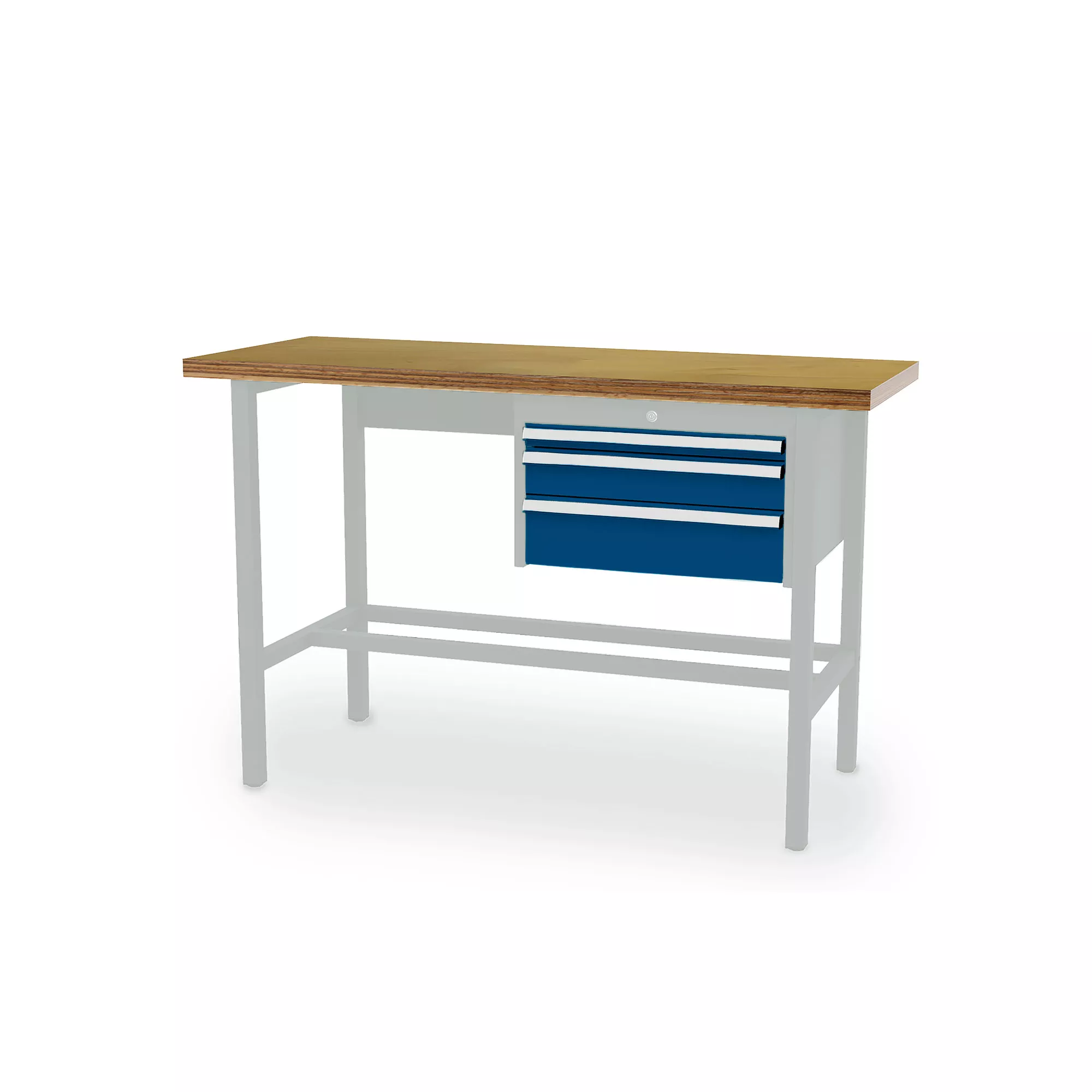 Der Arbeitstisch besticht durch seine exzellente Verarbeitung und das herausragende Preis-Leistungs-Verhältnis. Die massive Buche-Multiplex-Platte sorgt für eine langlebige und robuste Arbeitsfläche, die auch intensiver Nutzung standhält. Mit einem Unterhängeschrank auf der rechten Seite und drei geräumigen Schubladen stellt der Tisch genügend Stauraum für Ihre Werkzeuge und Materialien zur Verfügung. Das Gestell ist aus pulverbeschichtetem Vierkantrohr gefertigt und bietet eine besonders große Stabilität.