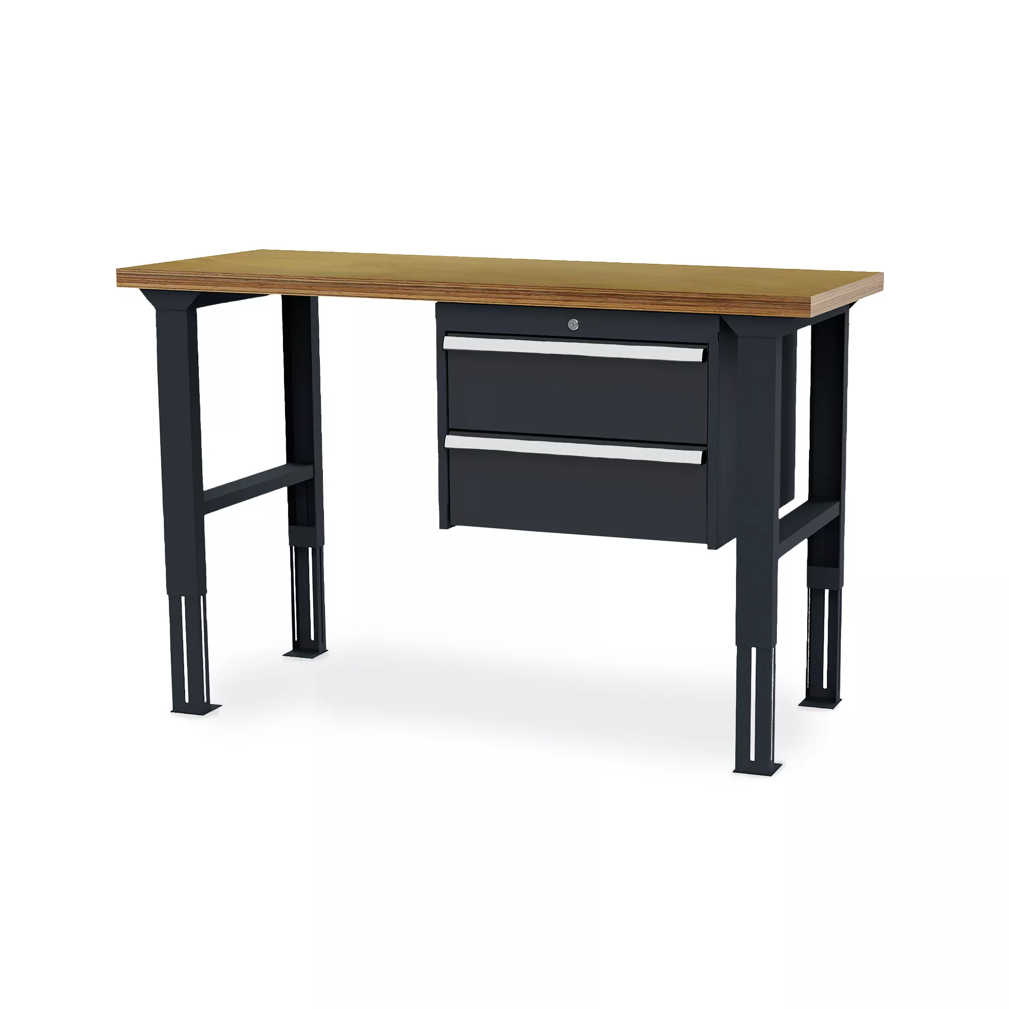 Der Arbeitstisch besticht durch seine erstklassige Verarbeitung und das sehr gute Preis-Leistungs-Verhältnis. Dank der stabilen Buche-Multiplex-Platte können Sie sicher sein, dass der Tisch selbst den anspruchsvollsten Aufgaben standhält. Er ist zudem mit einem praktischen Unterhängeschrank auf der rechten Seite ausgestattet, der Ihnen mit zwei Schubladen ausreichend Stauraum bietet. Die höhenverstellbaren Fußgestelle ermöglichen es Ihnen, die Arbeitshöhe individuell anzupassen und somit ergonomisch zu arbeiten.