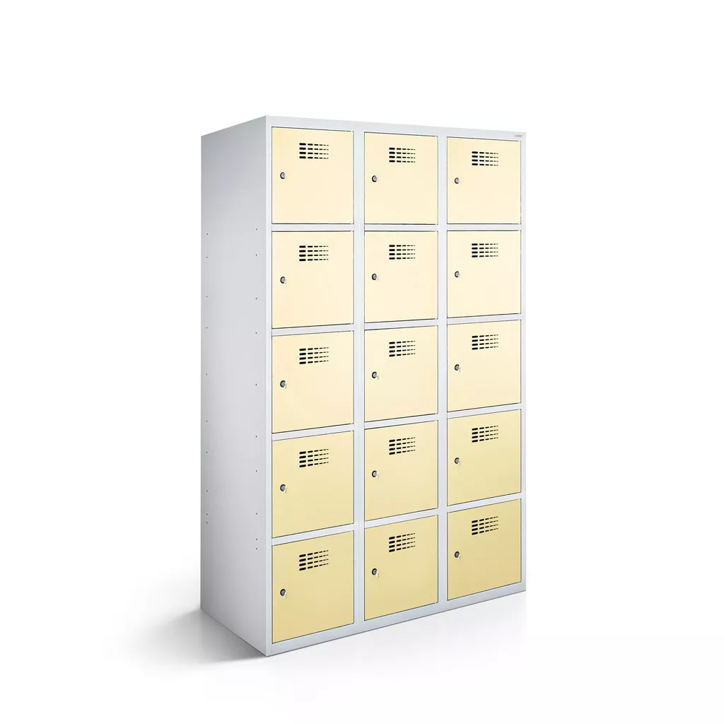 Der Schließfachschrank bietet praktischen Stauraum für Rucksäcke, Taschen, Jacken und vieles mehr. Dadurch ist er vielseitig einsetzbar in Schulen, Freizeiteinrichtungen und Unternehmen. Der Korpus ist aus stabilem, pulverbeschichtetem Stahlblech gefertigt. Abgerundete Kanten und glatt einliegende Türen unterstreichen das moderne Design des Fächerschranks. Für eine gute Luftzirkulation im Fachinneren sorgen die Lüftungslöcher in den Türen.