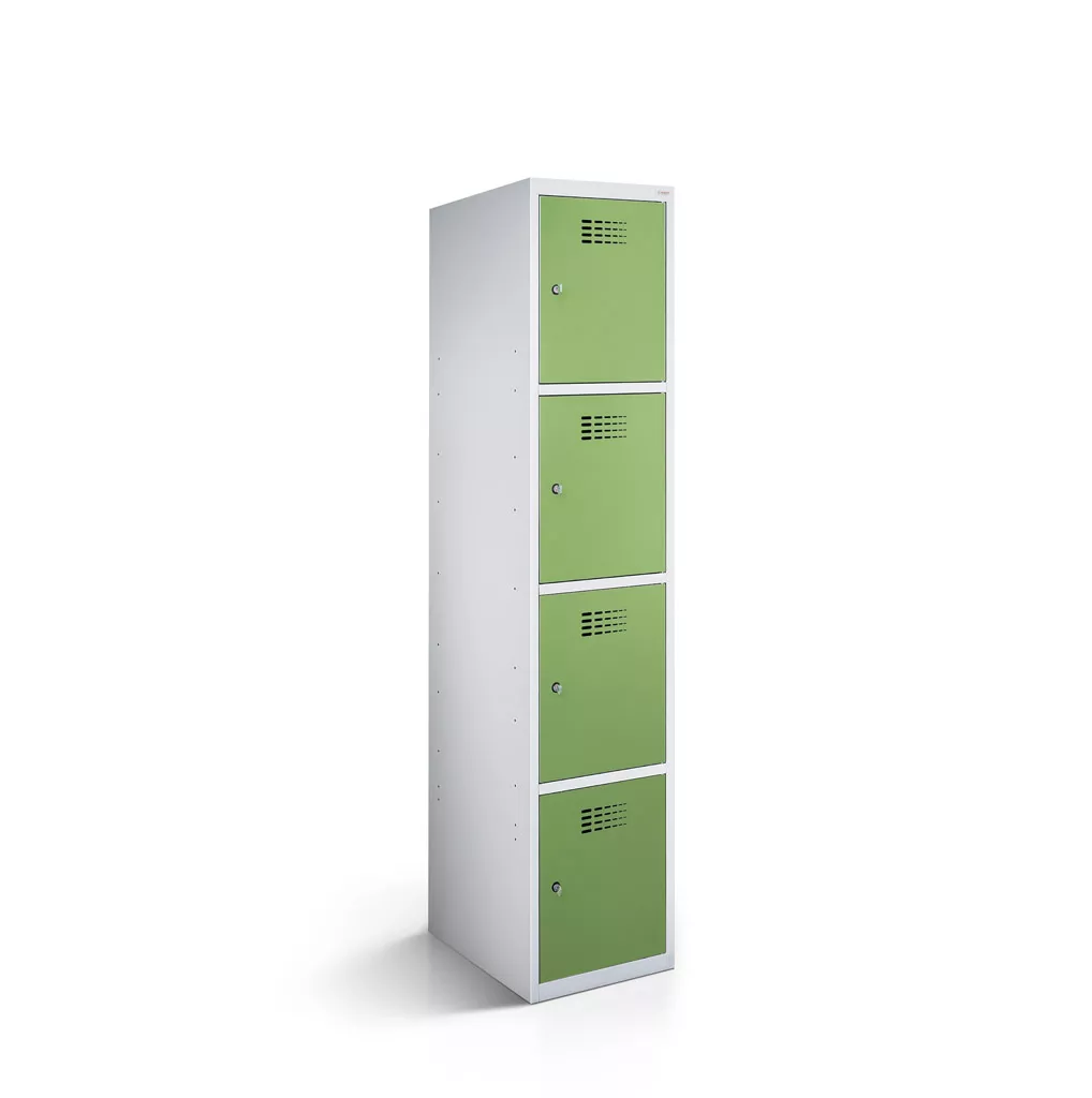 Der Schließfachschrank bietet praktischen Stauraum für Rucksäcke, Taschen, Jacken und vieles mehr. Dadurch ist er vielseitig einsetzbar in Schulen, Freizeiteinrichtungen und Unternehmen. Der Korpus ist aus stabilem, pulverbeschichtetem Stahlblech gefertigt. Abgerundete Kanten und glatt einliegende Türen unterstreichen das moderne Design des Fächerschranks. Für eine gute Luftzirkulation im Fachinneren sorgen die Lüftungslöcher in den Türen.