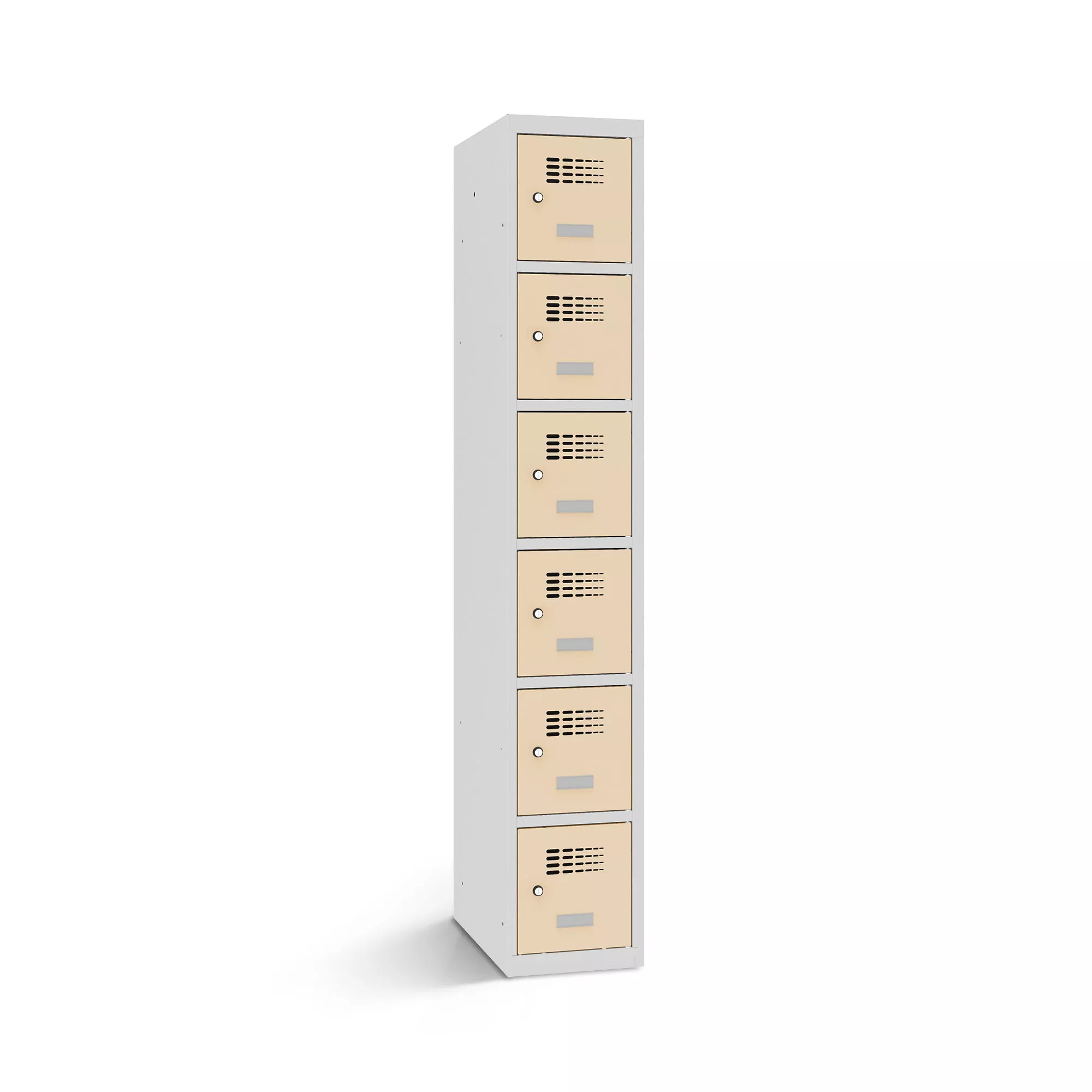 Der Schließfachschrank bietet praktischen Stauraum für Rucksäcke, Taschen, Jacken und vieles mehr. Dadurch ist er vielseitig einsetzbar in Schulen, Freizeiteinrichtungen und Unternehmen. Der Korpus ist aus stabilem, pulverbeschichtetem Stahlblech gefertigt. Abgerundete Kanten und glatt einliegende Türen unterstreichen das moderne Design des Fächerschranks. Für eine gute Luftzirkulation im Fachinneren sorgen die Lüftungslöcher in den Türen.