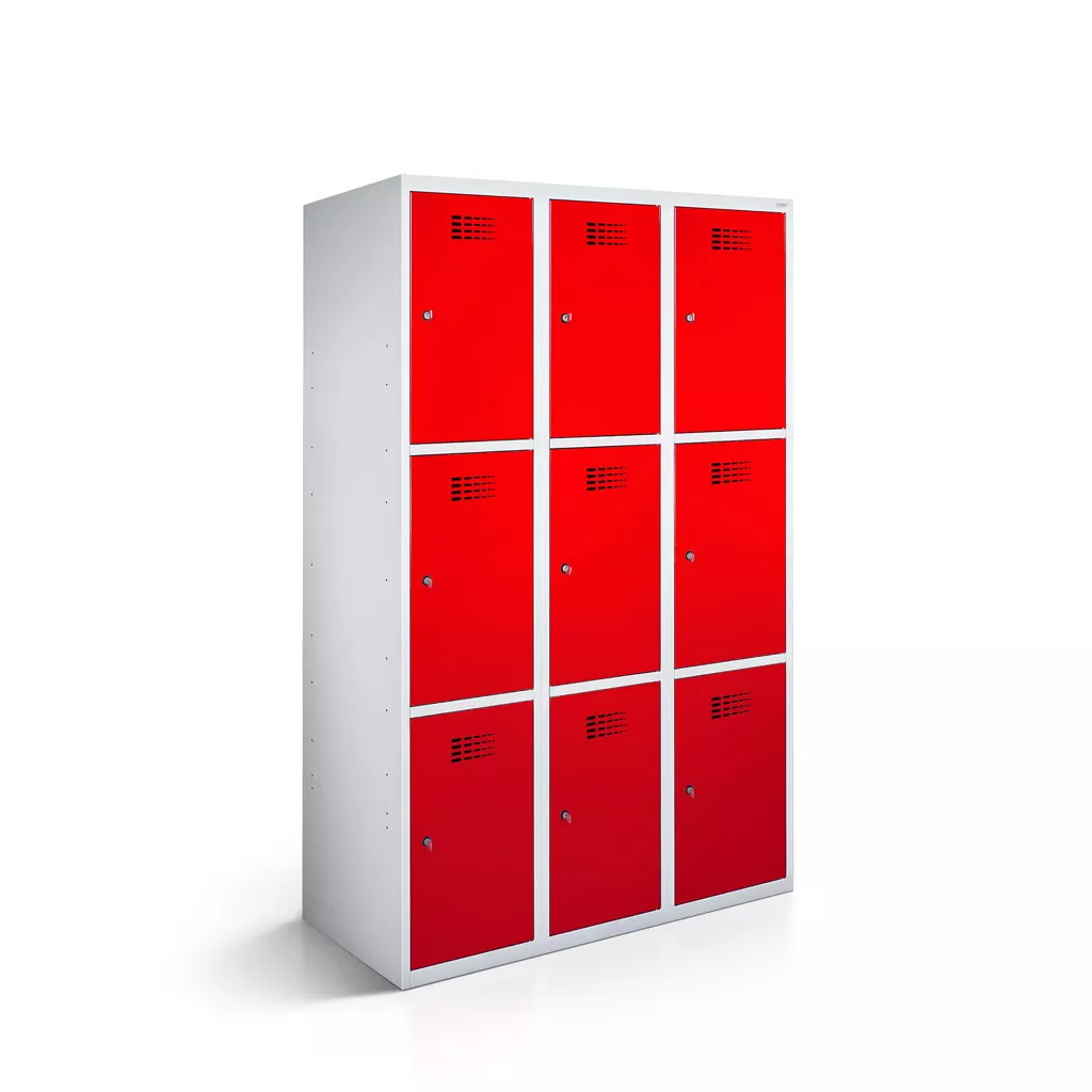Der Schließfachschrank bietet praktischen Stauraum für Rucksäcke, Taschen, Jacken und vieles mehr. Dadurch ist er vielseitig einsetzbar in Schulen, Freizeiteinrichtungen und Unternehmen. Der Korpus ist aus stabilem, pulverbeschichtetem Stahlblech gefertigt. Abgerundete Kanten und glatt einliegende Türen unterstreichen das moderne Design des Fächerschranks. Für eine gute Luftzirkulation im Fachinneren sorgen die Lüftungslöcher in den Türen.