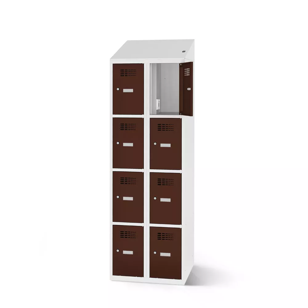Der Fächerschrank bietet praktischen Stauraum für Rucksäcke, Taschen, Jacken und vieles mehr. In jedem Fach befinden sich zudem eine Steckdose sowie ein USB-A- und ein USB-C-Anschluss. Damit eignet sich der Fächerschrank ideal zum Aufladen von Akku-Geräten wie Smartphones, Tablets oder Laptops.
