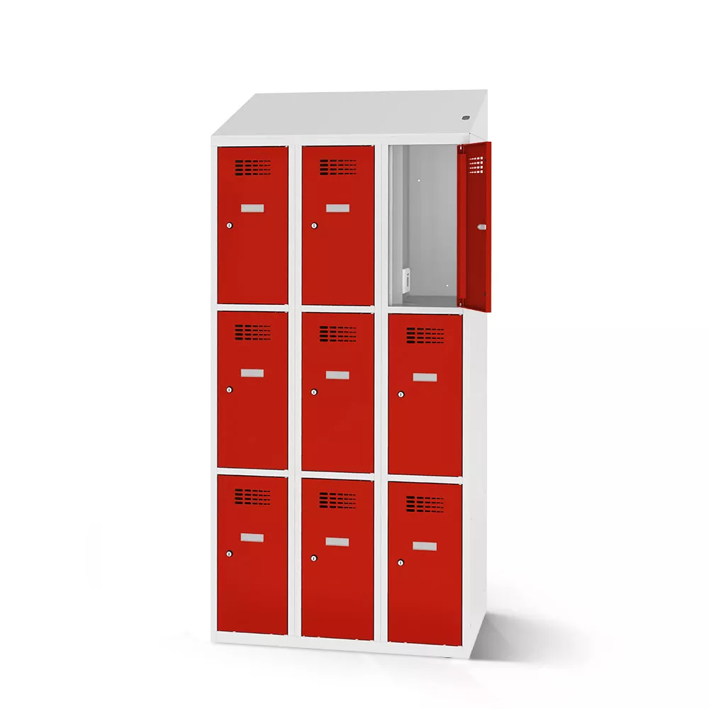 Aufgrund seiner Flexibilität ist er vielseitig einsetzbar in Schulen, Freizeiteinrichtungen und Unternehmen. Der Korpus ist aus stabilem, pulverbeschichtetem Stahlblech gefertigt. Abgerundete Kanten und glatt einliegende Türen unterstreichen das moderne Design des Fächerschranks. Für eine gute Luftzirkulation im Fachinneren sorgen die Lüftungslöcher in den Türen.