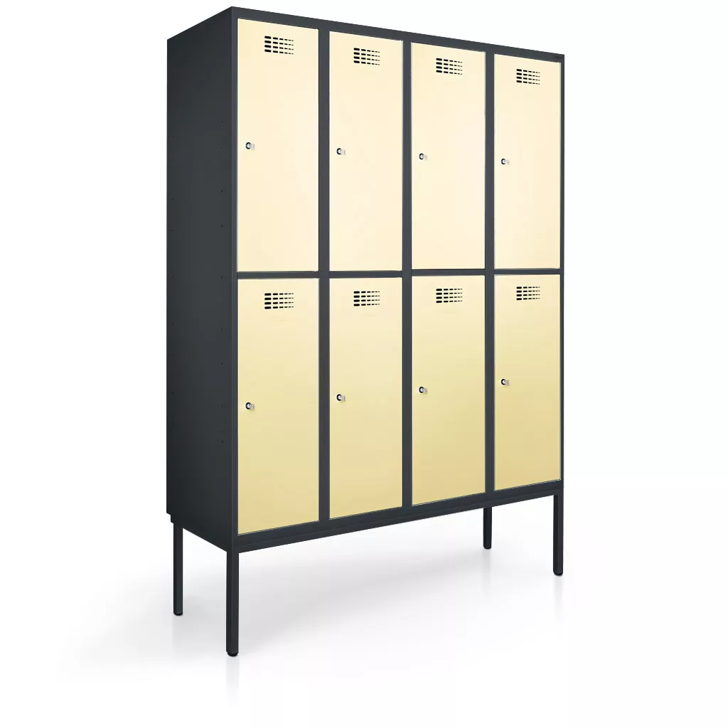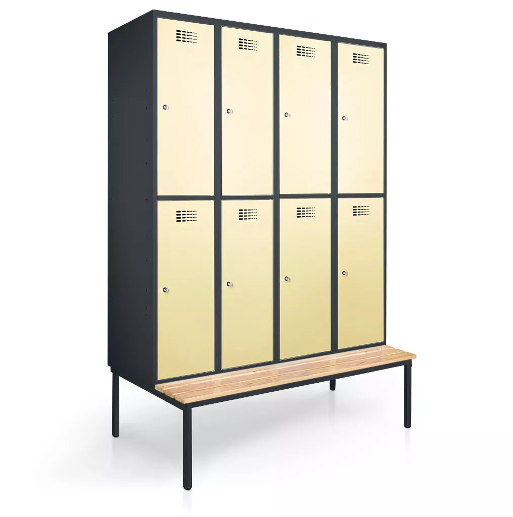 Wenn Sie trotz eines begrenzten Platzangebots möglichst viel Stauraum für die Garderobe Ihrer Kunden oder Mitarbeiter wünschen, dann ist der Garderobenspind für Sie die richtige Wahl. Die zwei übereinander angeordneten Abteile verfügen jeweils über eine robuste Kleiderstange, die mit zwei verschiebbaren Haken versehen ist. Die Abteilböden sind glatt auskehrbar.