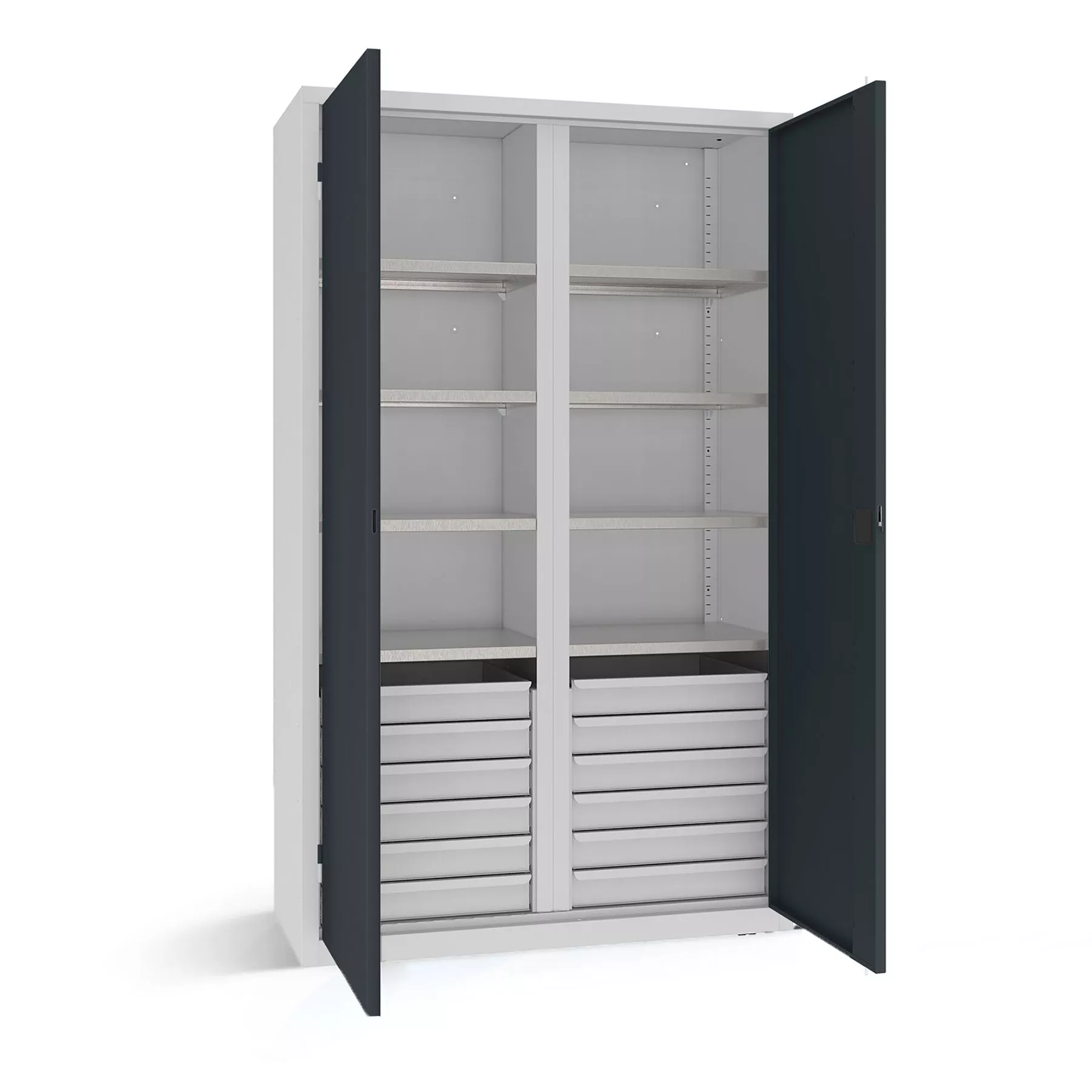 Der Schwerlastschrank verfügt über verzinkte Fachböden mit einer Tragkraft von jeweils bis zu 100 kg. Außerdem besitzt er einen Schubladenblock mit robusten Auszügen, die einem Gewicht von bis zu 40 kg standhalten.