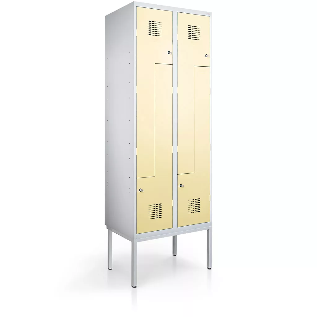 Der Z-Spind ist die ideale Wahl für Umkleiden mit begrenztem Platzangebot. Dank seiner z-förmigen Fächer bietet der Spind ausreichend Stauraum für lange Kleidung ebenso wie für Schuhe oder Taschen. Der Spind ist standardmäßig mit einem stabilen Fachboden, einer Kleiderstange sowie verschiebbaren Haken ausgestattet. Die perforierten Spindtüren sorgen für eine gute Belüftung.