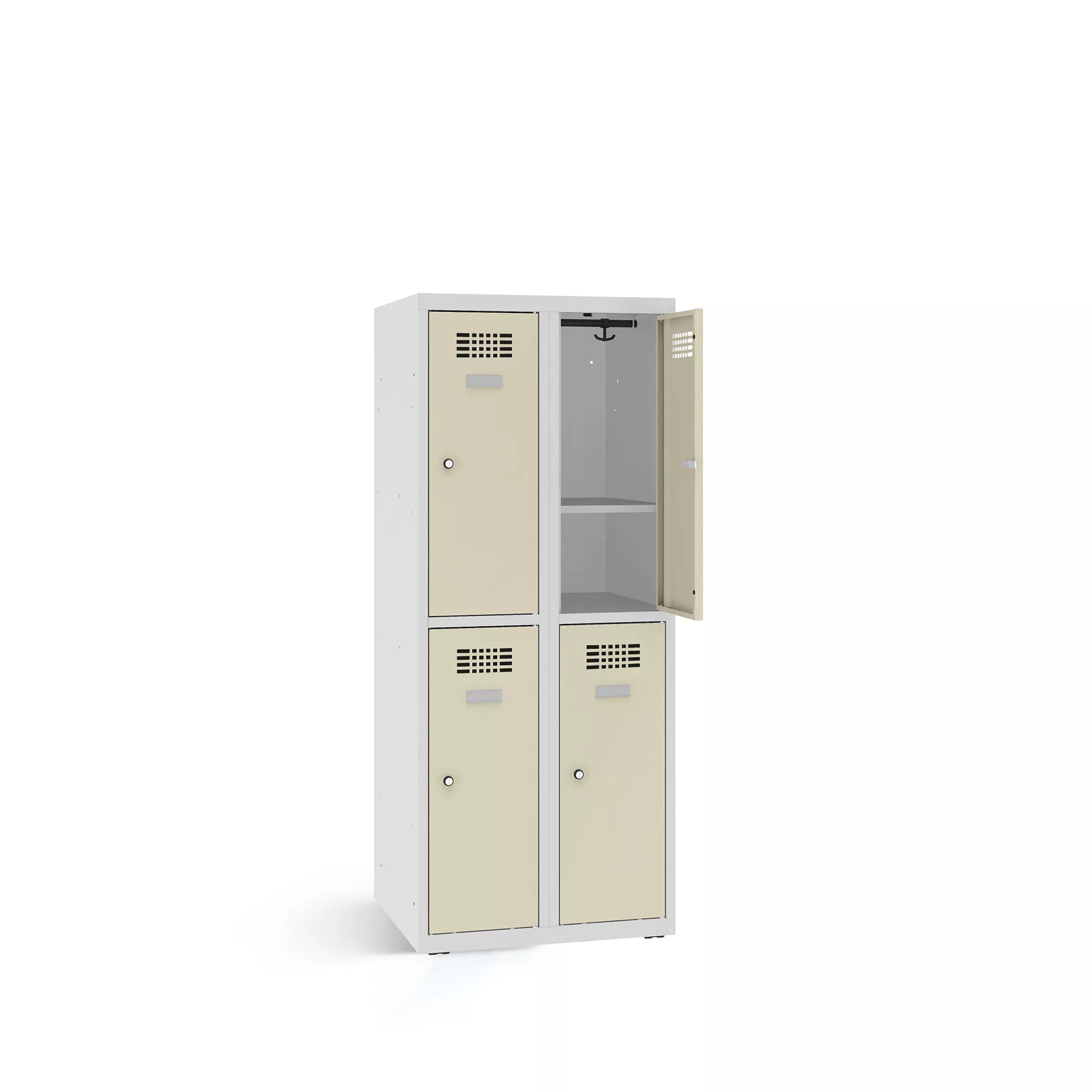 La structure est composée de deux niveaux de casiers superposés. Chaque casier est équipé d’une porte, d'une tringle robuste avec deux crochets coulissants. A l'intérieur, les étagères sont planes et faciles à nettoyer, assurant une hygiène parfaite.