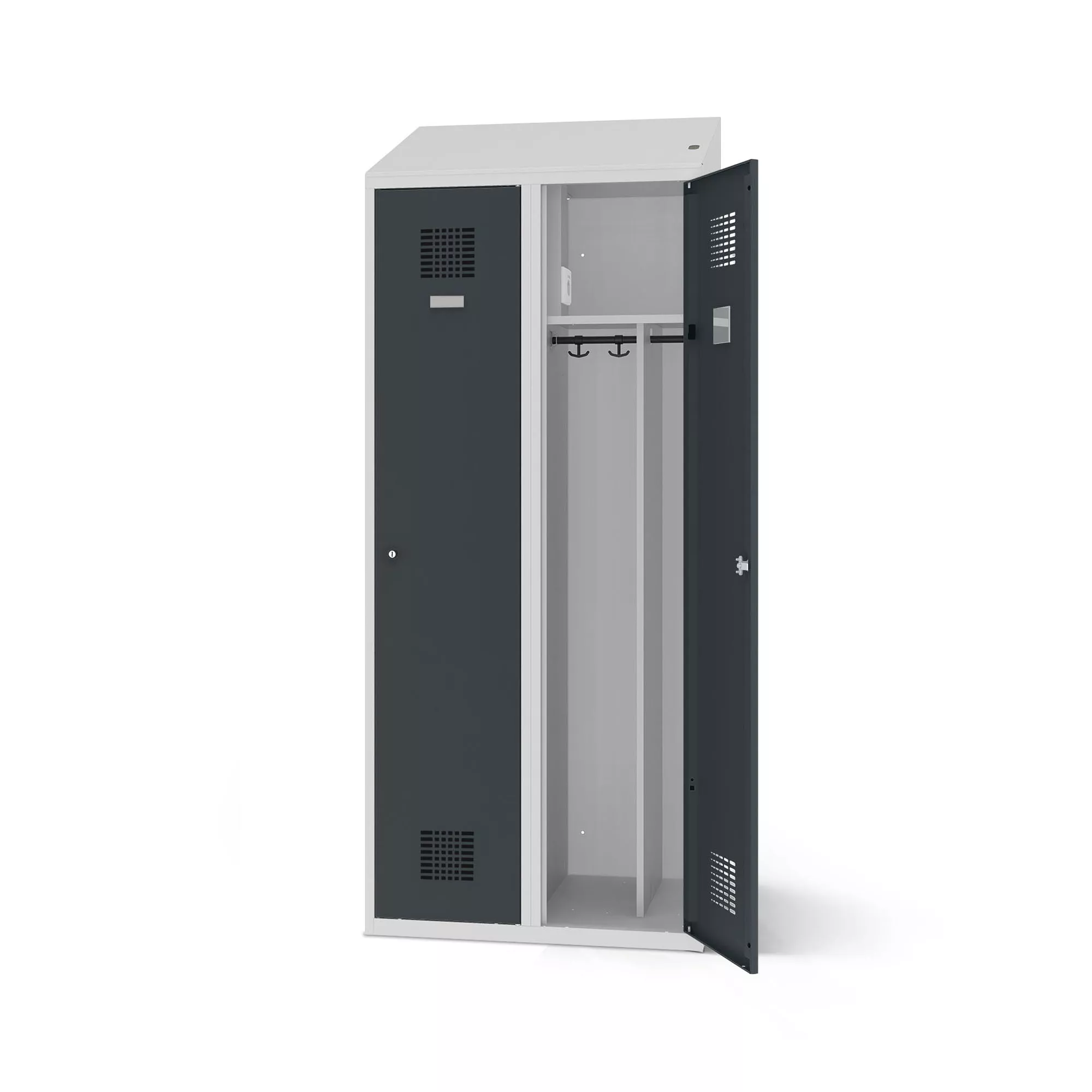 The Clothes locker with charging function comes standard with a slanted roof under which the electrics are located. A thermal fuse and overvoltage protection ensure reliable operation. In addition, an LED indicator signals the existing power supply.