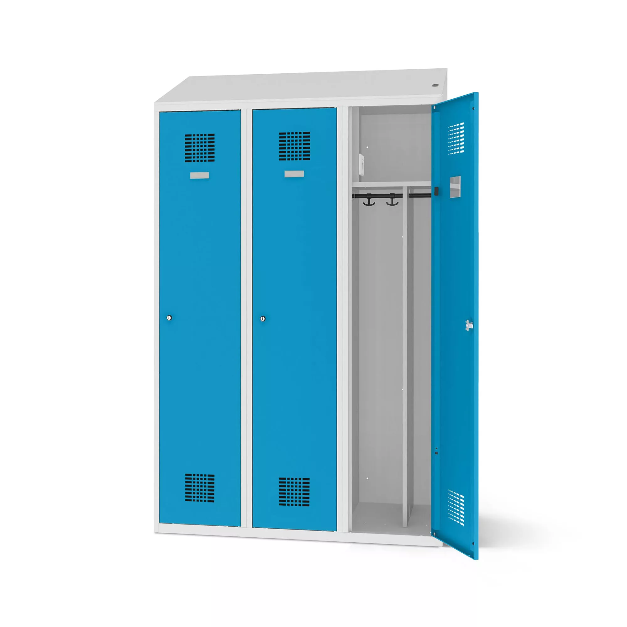 With the Clothes locker with charging function from LOCKEEL® you get a robust steel locker for your changing room. The locker is standard equipped with a sturdy shelf, a clothes rail and sliding hooks. In addition, there is a socket and two USB ports (USB-A and USB-C) in the compartment. This makes the clothes locker ideal for charging battery devices such as smartphones, tablets or laptops.