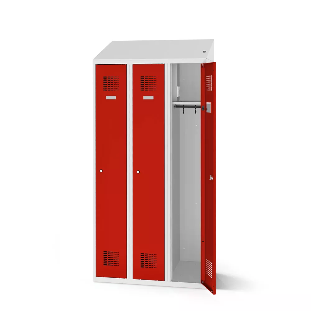 The Clothes locker with charging function comes standard with a slanted roof under which the electrics are located. A thermal fuse and overvoltage protection ensure reliable operation. In addition, an LED indicator signals the existing power supply.