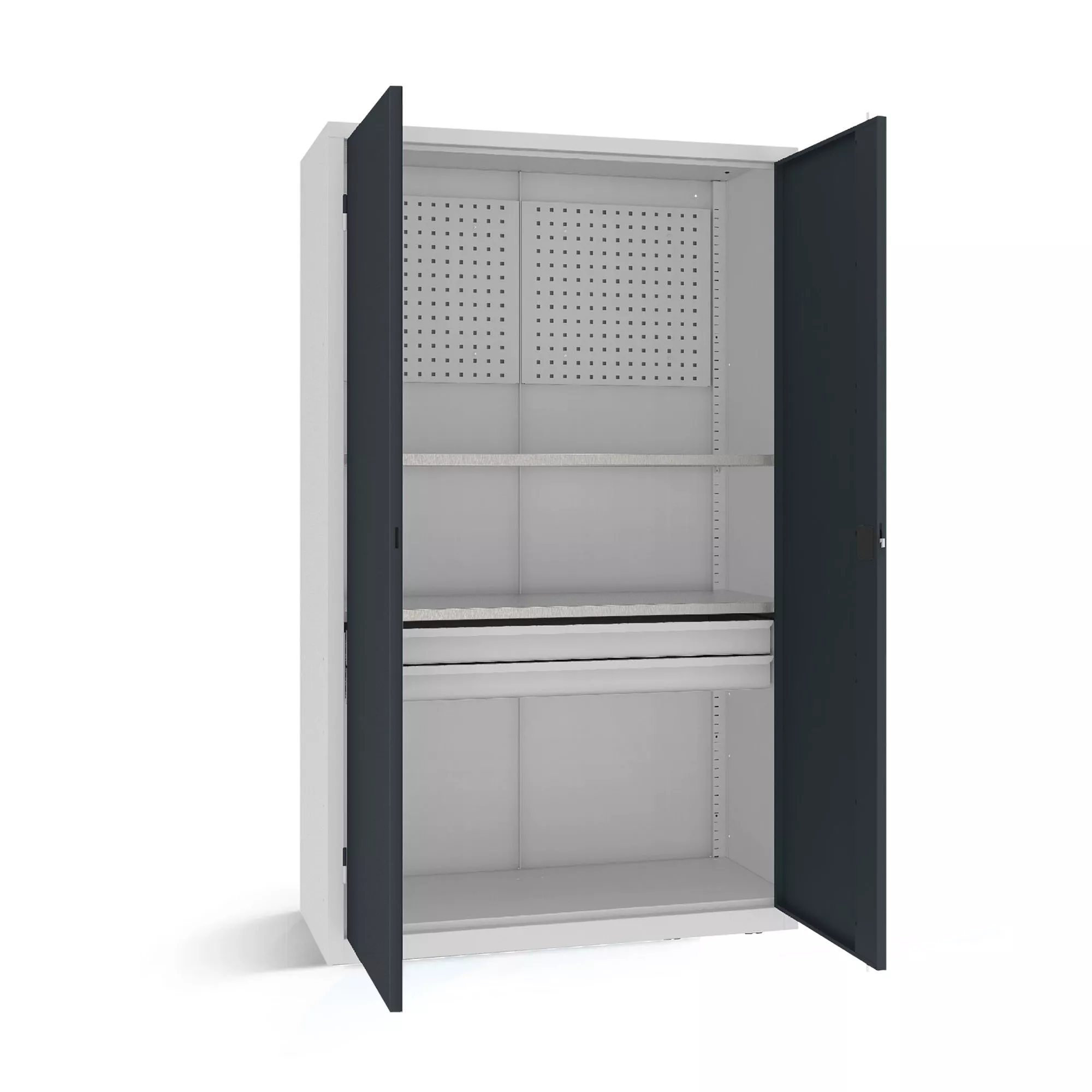 Heavy-duty workshop cabinet with 2 drawers 2 shelves and tool panel 199 x 120