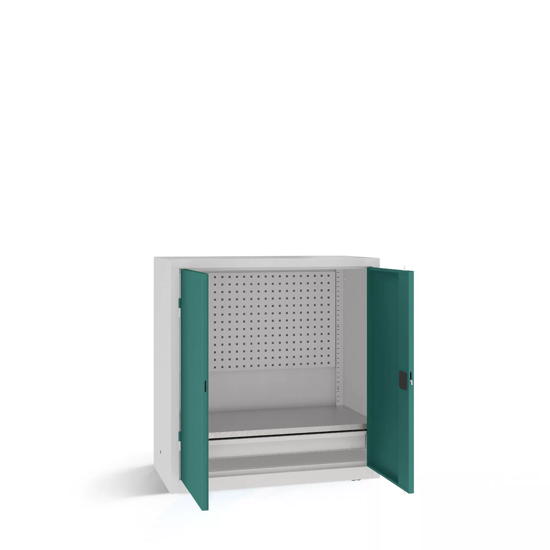 The heavy-duty cabinet has a galvanized shelf with a load capacity of up to 100 kg and a drawer with a robust pull-out that can withstand a weight of up to 40 kg. A tool panel on the inside of the rear wall of the cabinet also gives you the option of attaching hooks and holders for tools.