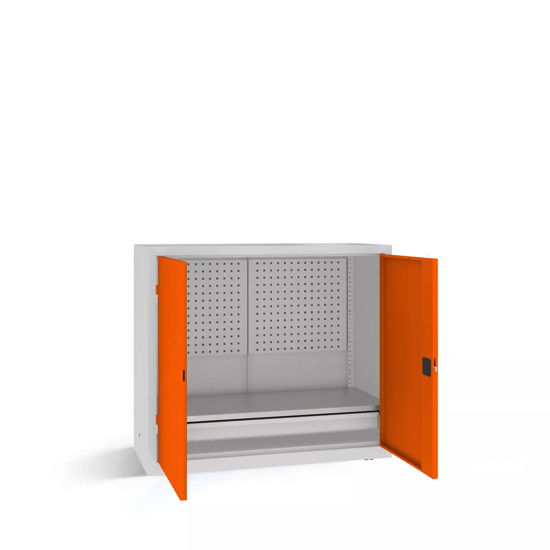 The heavy-duty cabinet has a galvanized shelf with a load capacity of up to 100 kg and a drawer with a robust pull-out that can withstand a weight of up to 40 kg. A tool panel on the inside of the rear wall of the cabinet also gives you the option of attaching hooks and holders for tools.