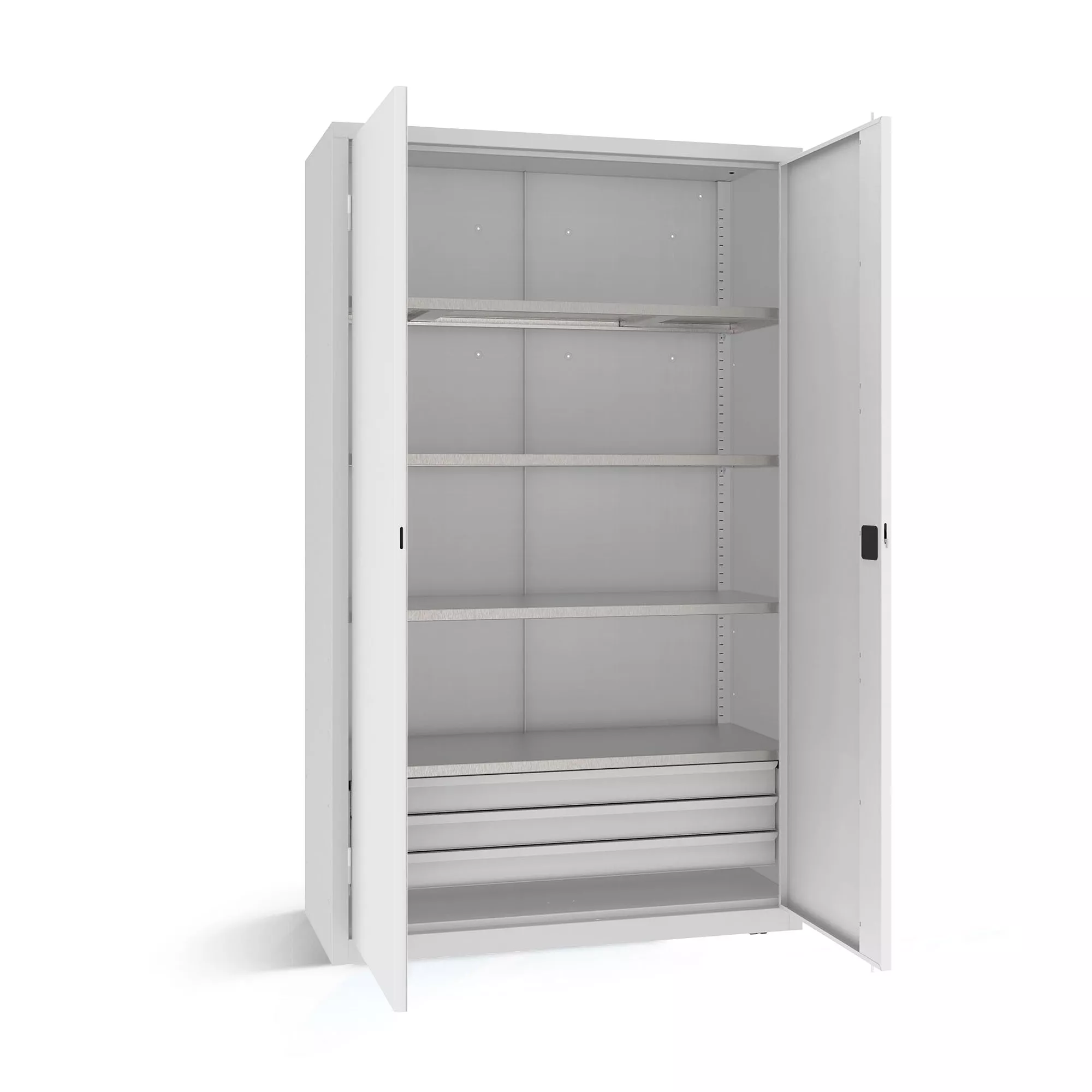 The heavy-duty cabinet has galvanized shelves with a load capacity of up to 100 kg each and practical drawers with robust pull-outs that can withstand a weight of up to 40 kg.