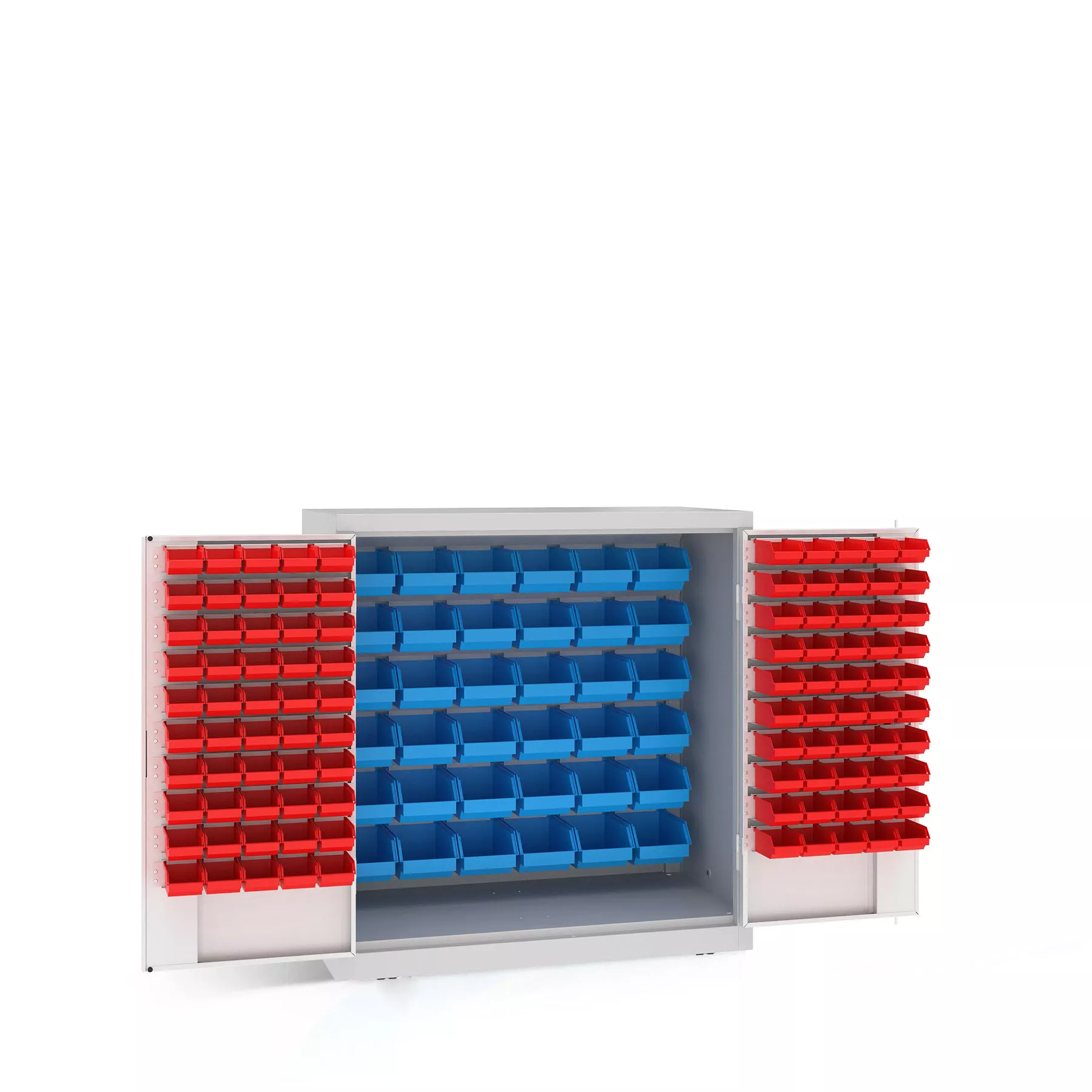 The heavy-duty cabinet has various storage boxes that differ in size and color. The larger blue boxes are located inside the cabinet. The smaller red boxes are attached to the two doors.