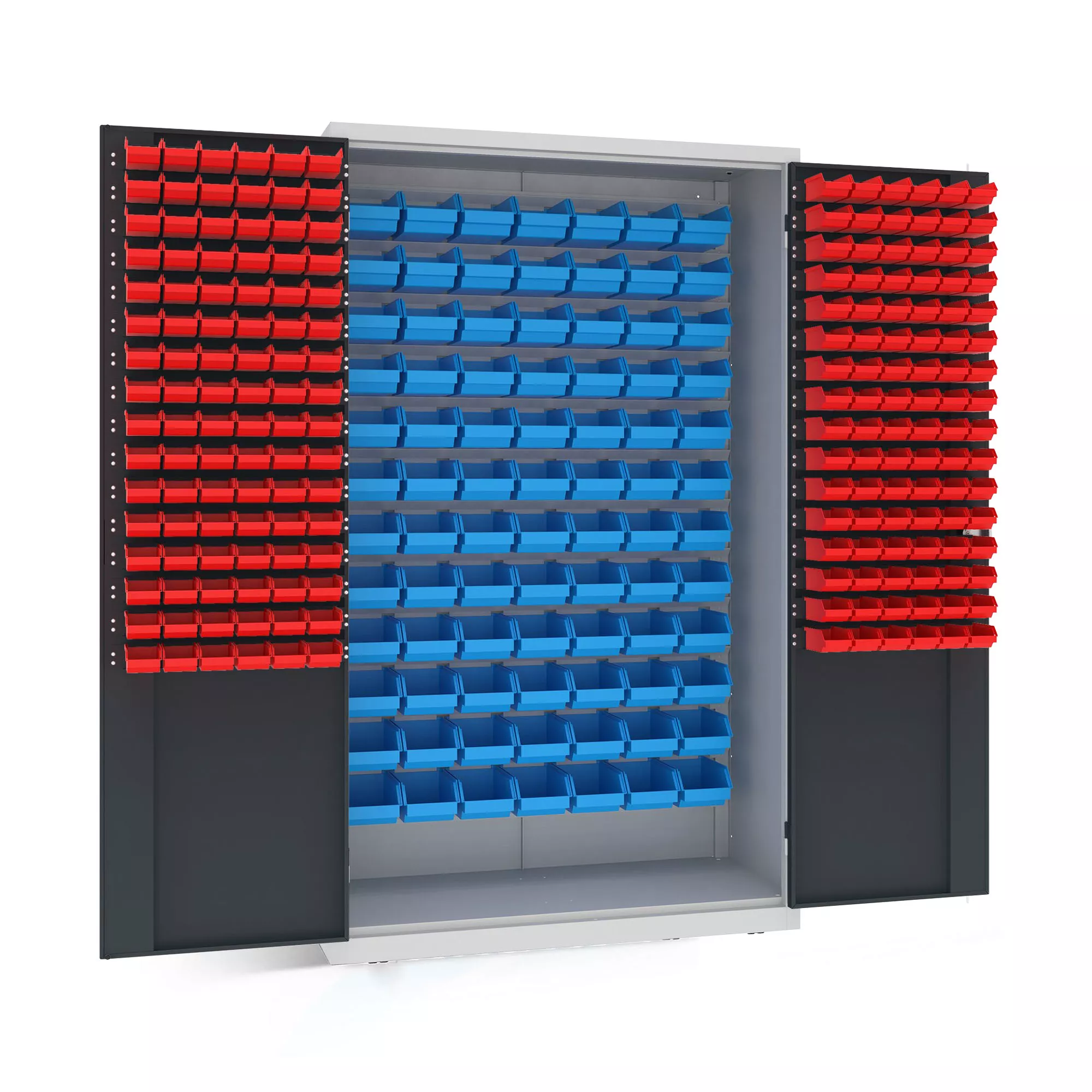 The heavy-duty cabinet has various storage boxes that differ in size and color. The larger blue boxes are located inside the cabinet. The smaller red boxes are attached to the two doors.