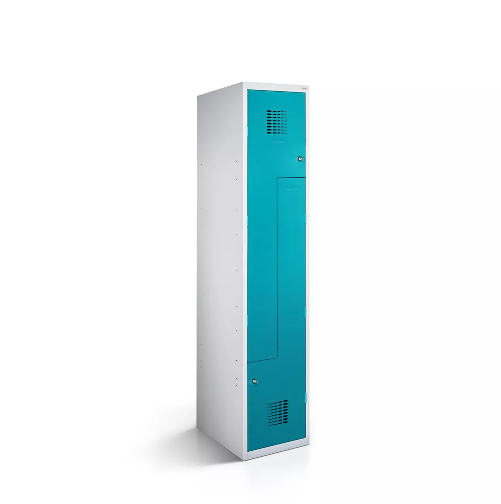 The L locker from LOCKEEL®is the ideal choice for locker rooms with limited space. Thanks to its L-shaped compartments, the locker offers sufficient storage space for long clothing as well as for shoes or bags. The locker comes standard with a sturdy shelf, a clothes rail and sliding hooks. The perforated locker doors provide good ventilation.