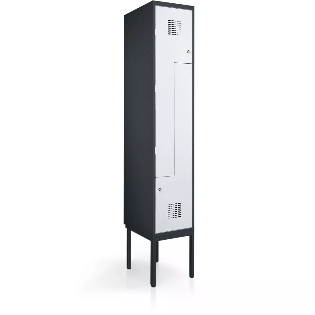 The L locker from LOCKEEL®is the ideal choice for locker rooms with limited space. Thanks to its L-shaped compartments, the locker offers sufficient storage space for long clothing as well as for shoes or bags. The locker comes standard with a sturdy shelf, a clothes rail and sliding hooks. The perforated locker doors provide good ventilation.