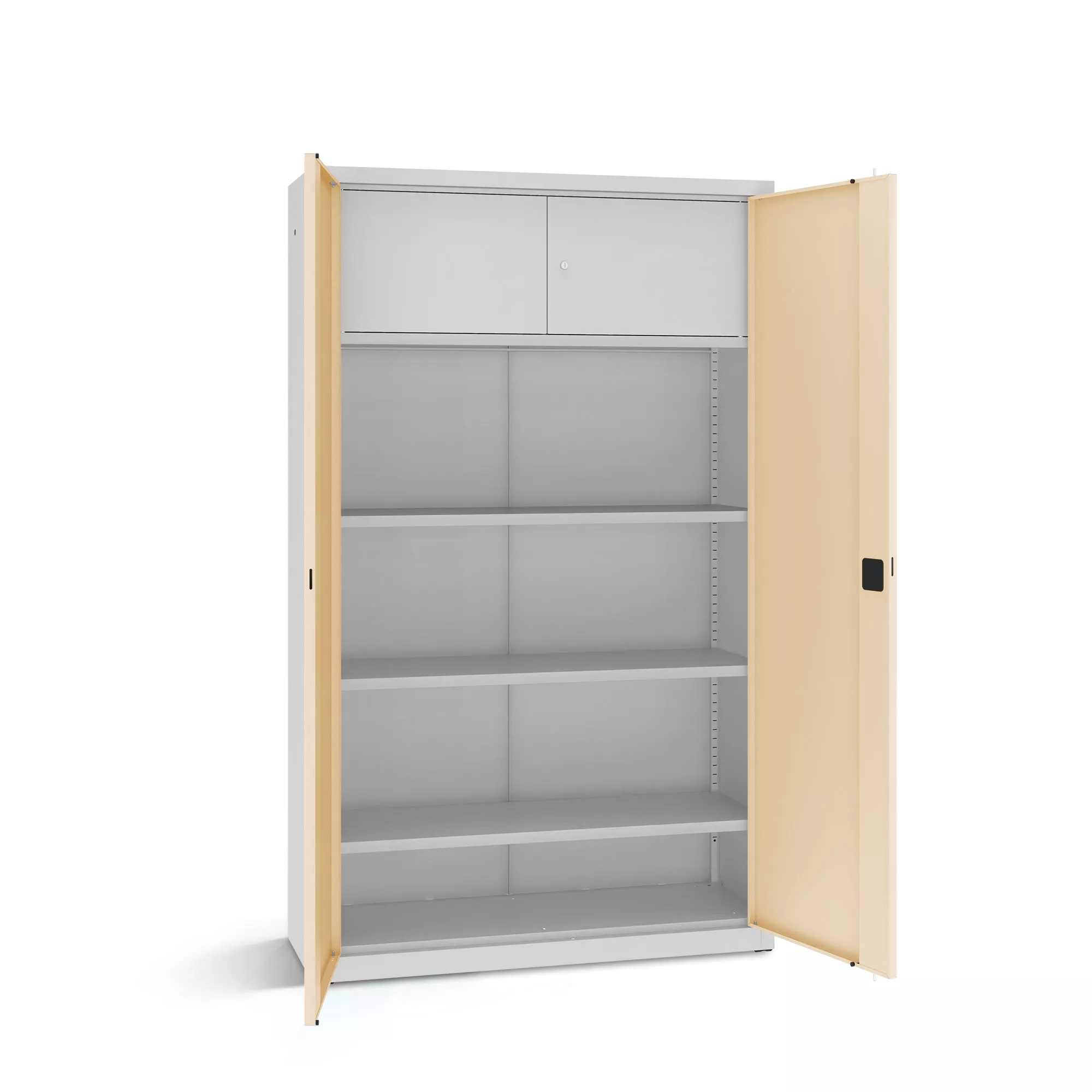 The LOCKEEL® metal office cabinet is perfect for furnishing offices, archive rooms or storage areas. It combines modular and secure storage space. It includes three height-adjustable shelves, each supporting up to 65 kg, as well as a separate secure locker with a lock, ideal for storing personal items or sensitive documents. Made from 0.7 mm powder-coated sheet steel, it is built to last. The swing doors open to 110° and are fixed to sturdy stainless steel pivots. They are secured by a cylinder lock handle with a 2-point locking system, ensuring GDPR-compliant storage.