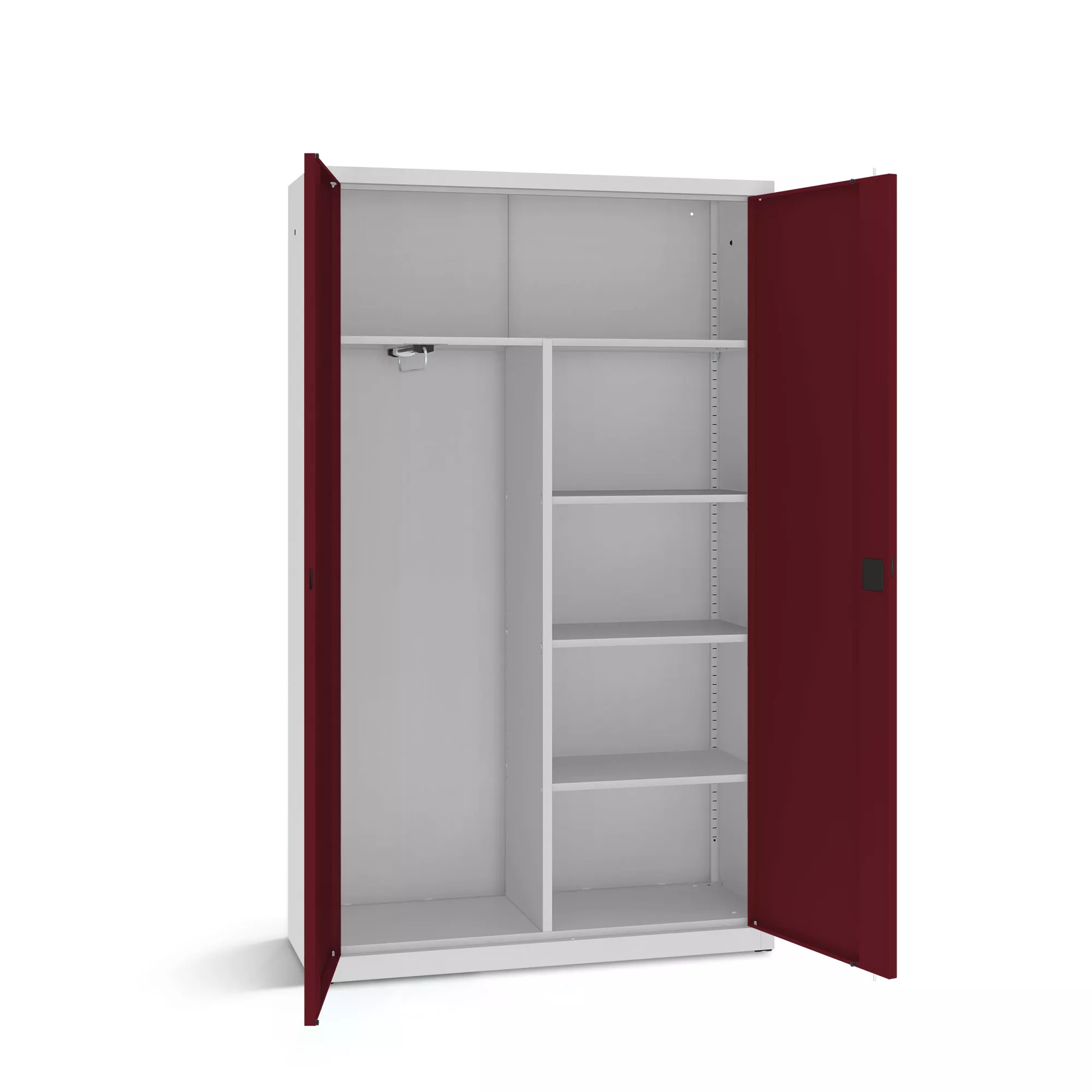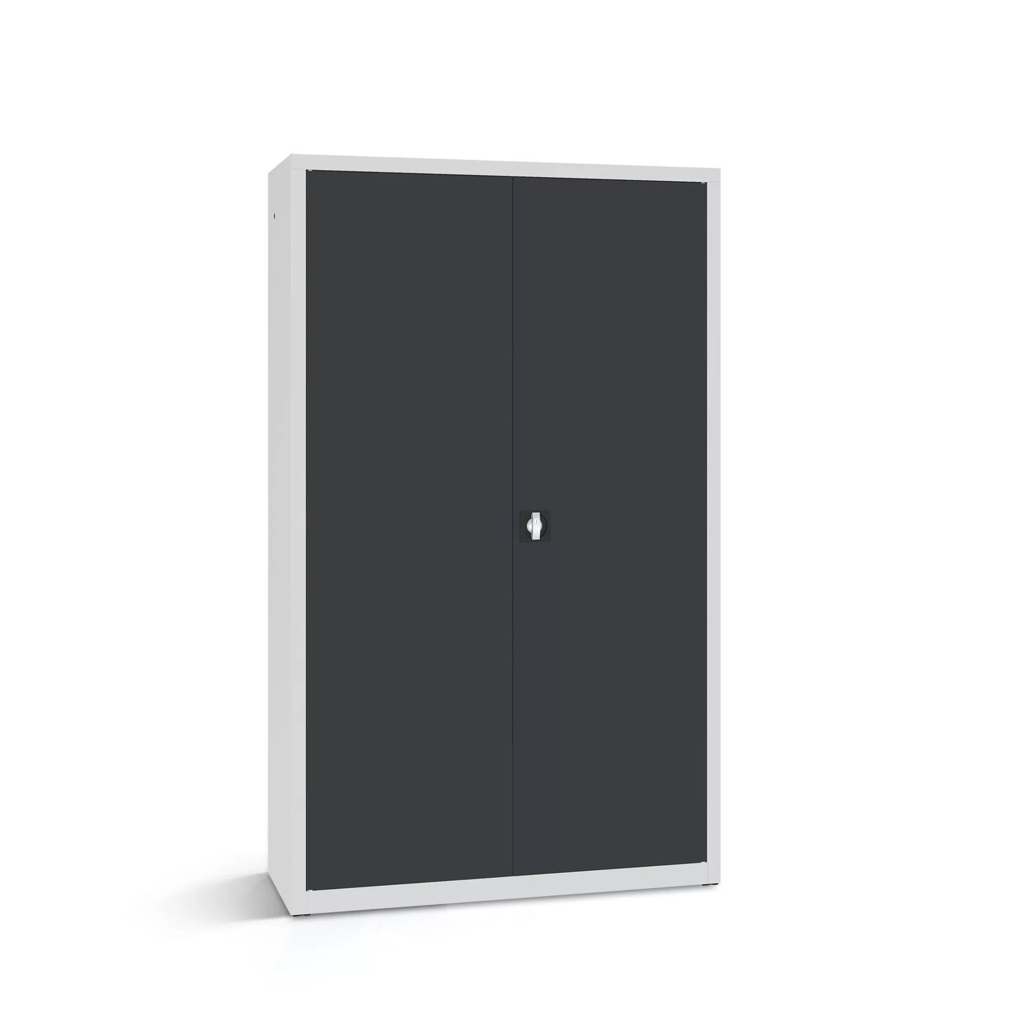 - On the right, height-adjustable shelves (maximum load of 65 kg per shelf) for storing files, files or supplies. The 0.7 mm thick powder-coated sheet steel structure guarantees strength and durability. The swing doors are mounted on stainless steel pivots, with a 110° opening angle and secure closure via a 2-point cylinder lock, ensuring GDPR-compliant storage.