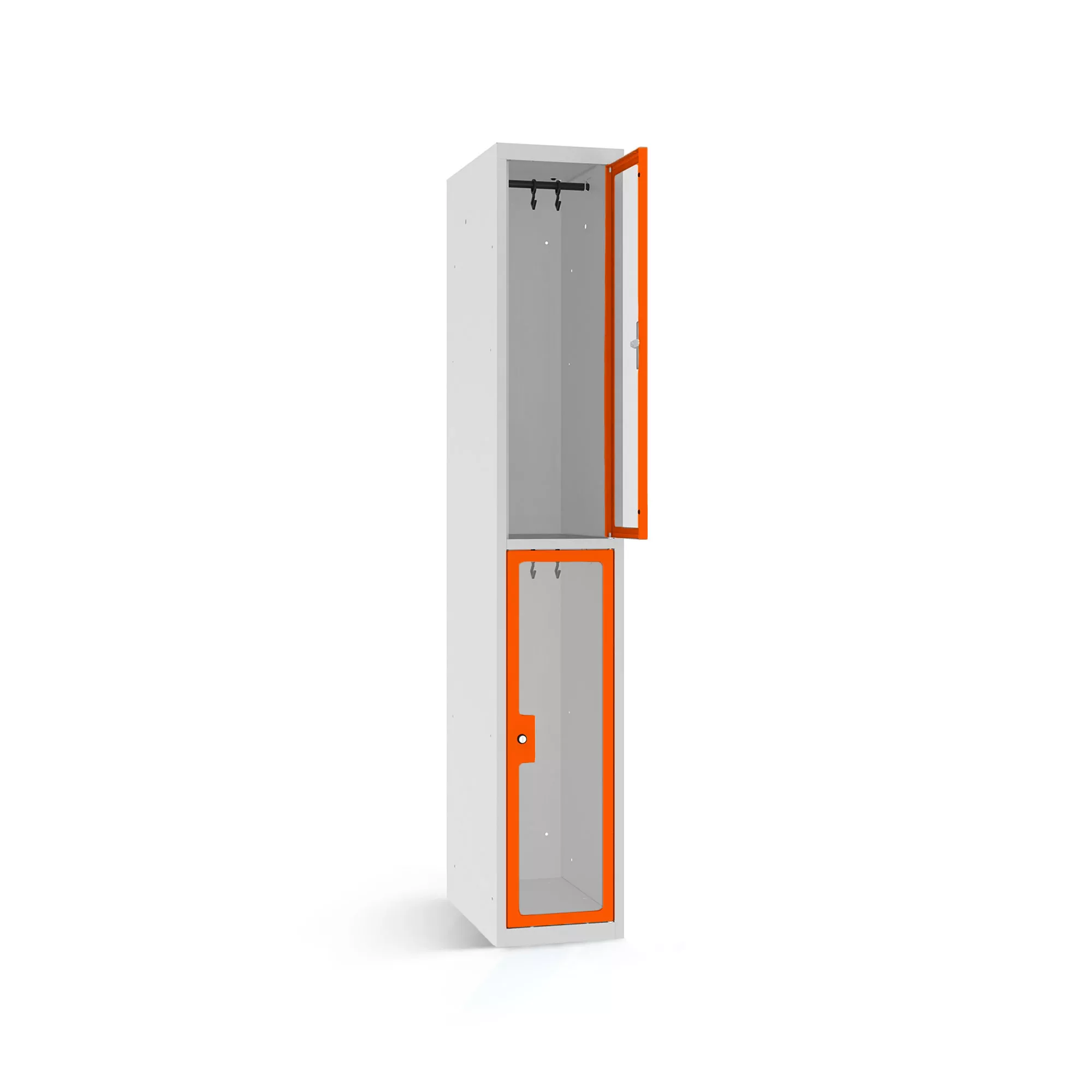 If you want as much storage space as possible for the wardrobe of your customers or employees despite limited space, then the coat locker from LOCKEEL®is the right choice for you. The two compartments, arranged one above the other, each have a sturdy clothes rail, which is equipped with two sliding hooks. The compartment shelves are smooth sweep out. To ensure a high level of security and optimal visibility, the locker doors are equipped with 4 mm thick Plexiglas viewing panels.