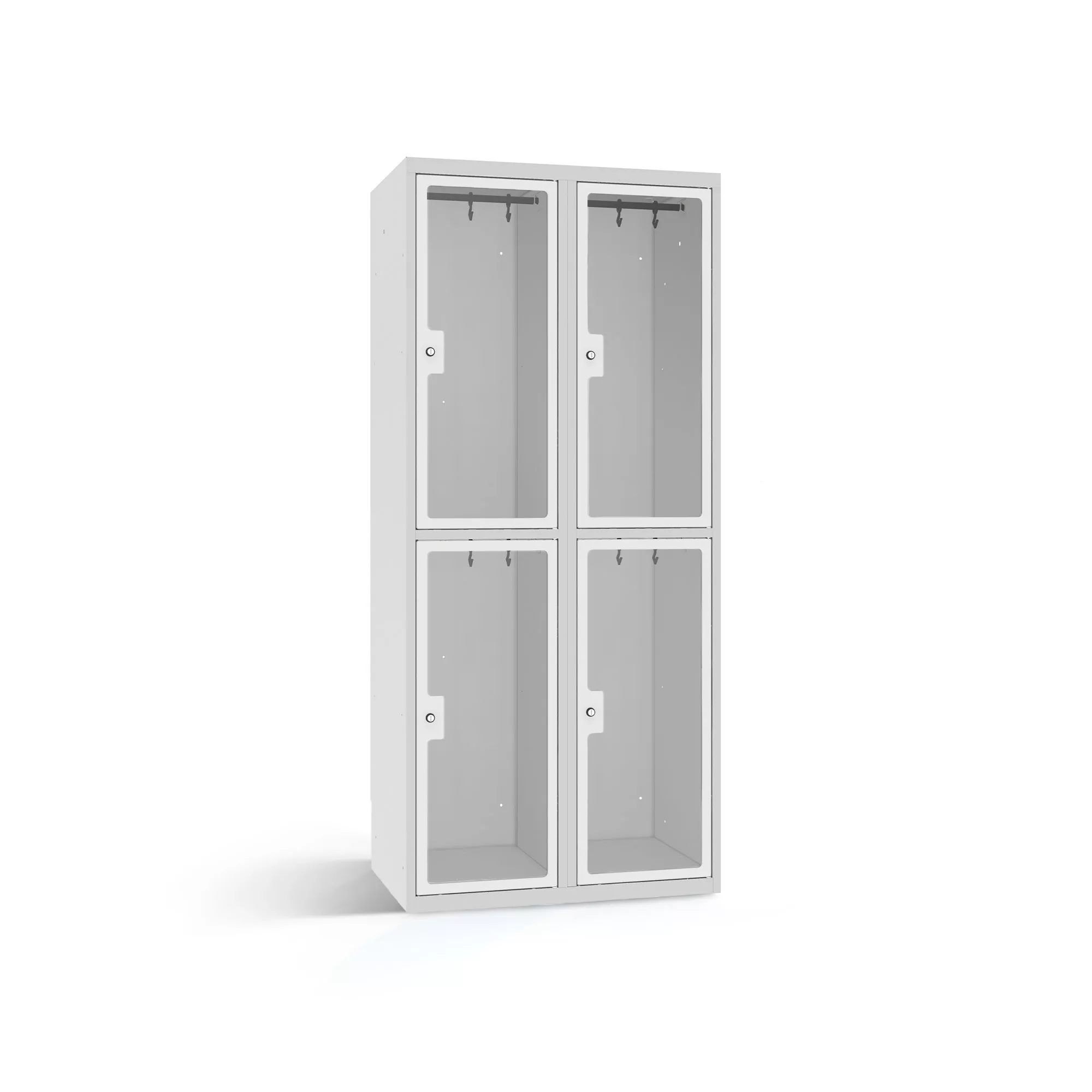 If you want as much storage space as possible for the wardrobe of your customers or employees despite limited space, then the coat locker from LOCKEEL®is the right choice for you. The four compartments, arranged one above the other, each have a sturdy clothes rail, which is equipped with two sliding hooks. The compartment shelves are smooth sweep out. To ensure a high level of security and optimal visibility, the locker doors are equipped with 4 mm thick Plexiglas viewing panels.