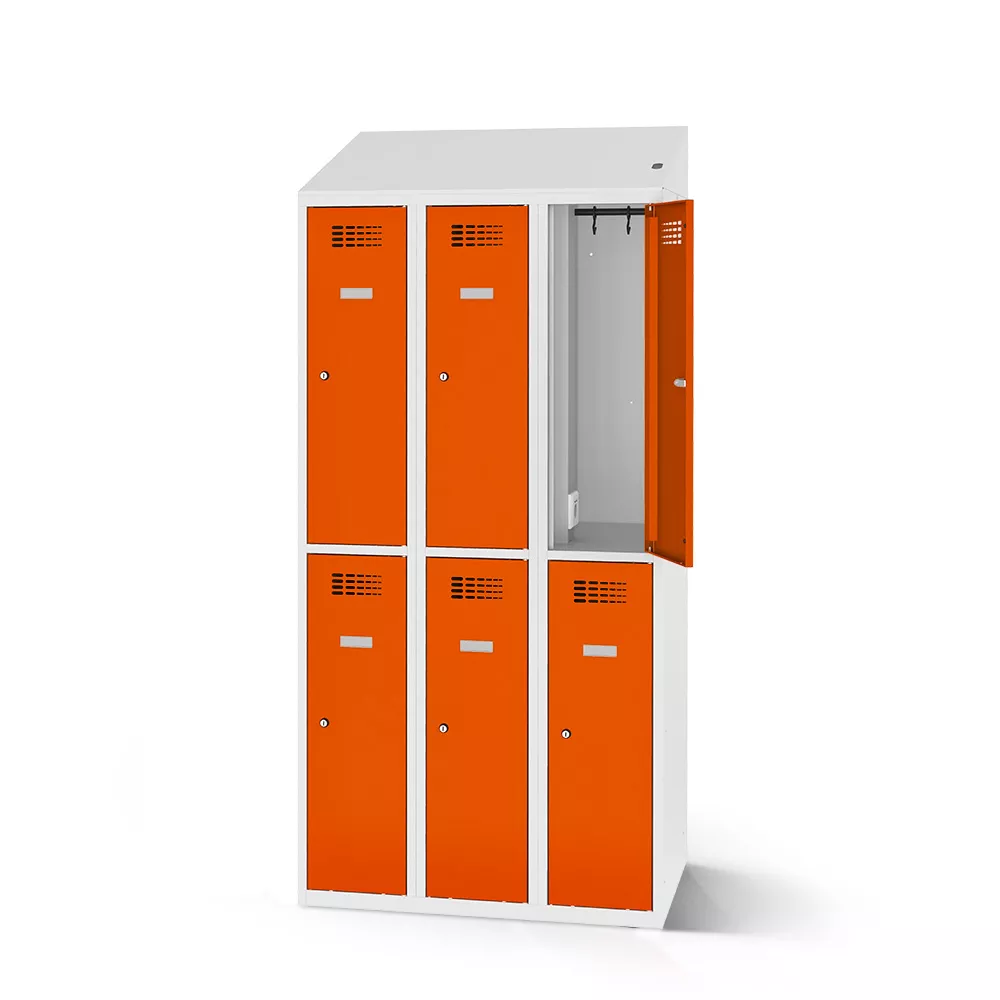 If you want as much storage space as possible for your customers' or employees' wardrobe despite limited space, the wardrobe locker from LOCKEEL® is the right choice for you. The two compartments, arranged one above the other, each have a sturdy clothes rail, which is equipped with two sliding hooks. The compartment shelves can be swept out smoothly.